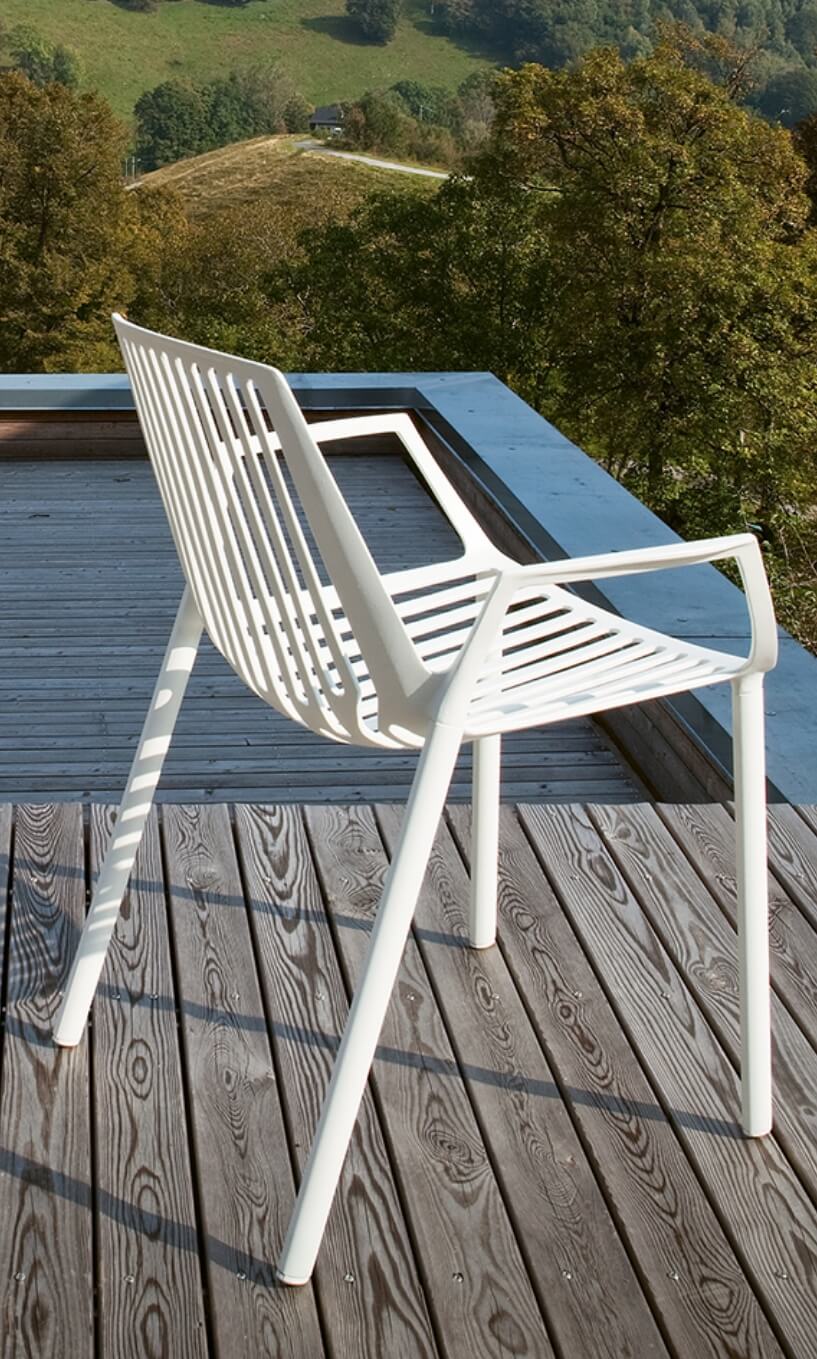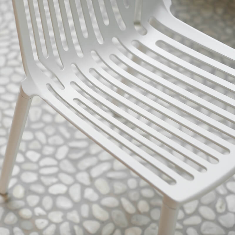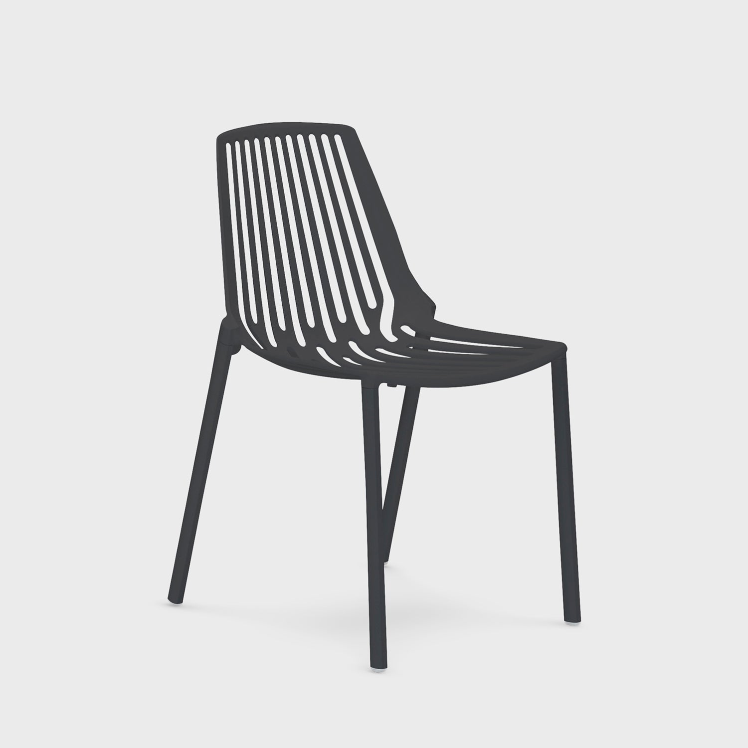 A high stacker of powder-coated, die-cast aluminum, Rion fits just as naturally on outdoor patios as it does in indoor rooms.