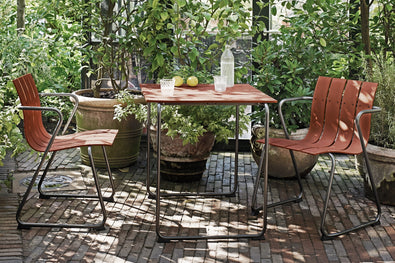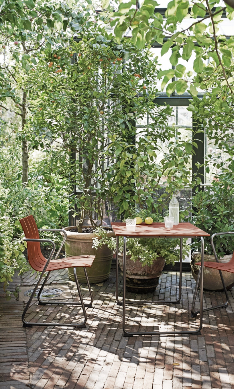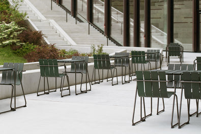 Simple shapes and a light profile characterize this outdoor table, made with recycled materials that keep waste out of the ocean. It's crafted by Mater, a Danish brand that champions sustainability and ethical design.
